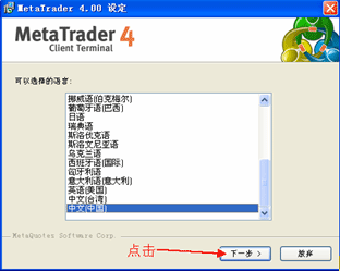 點擊已經(jīng)下載的mt4安裝文件,彈出安裝窗口后,選擇語言,如下圖: